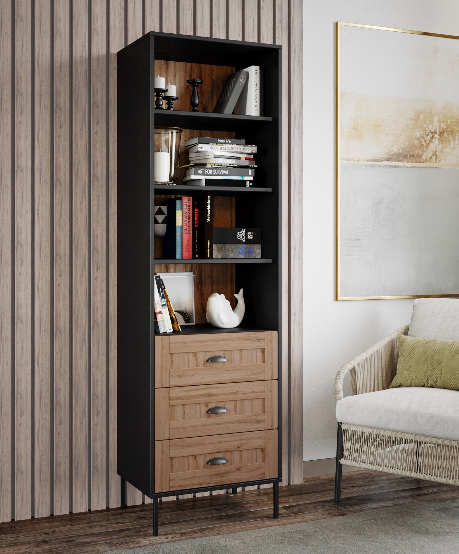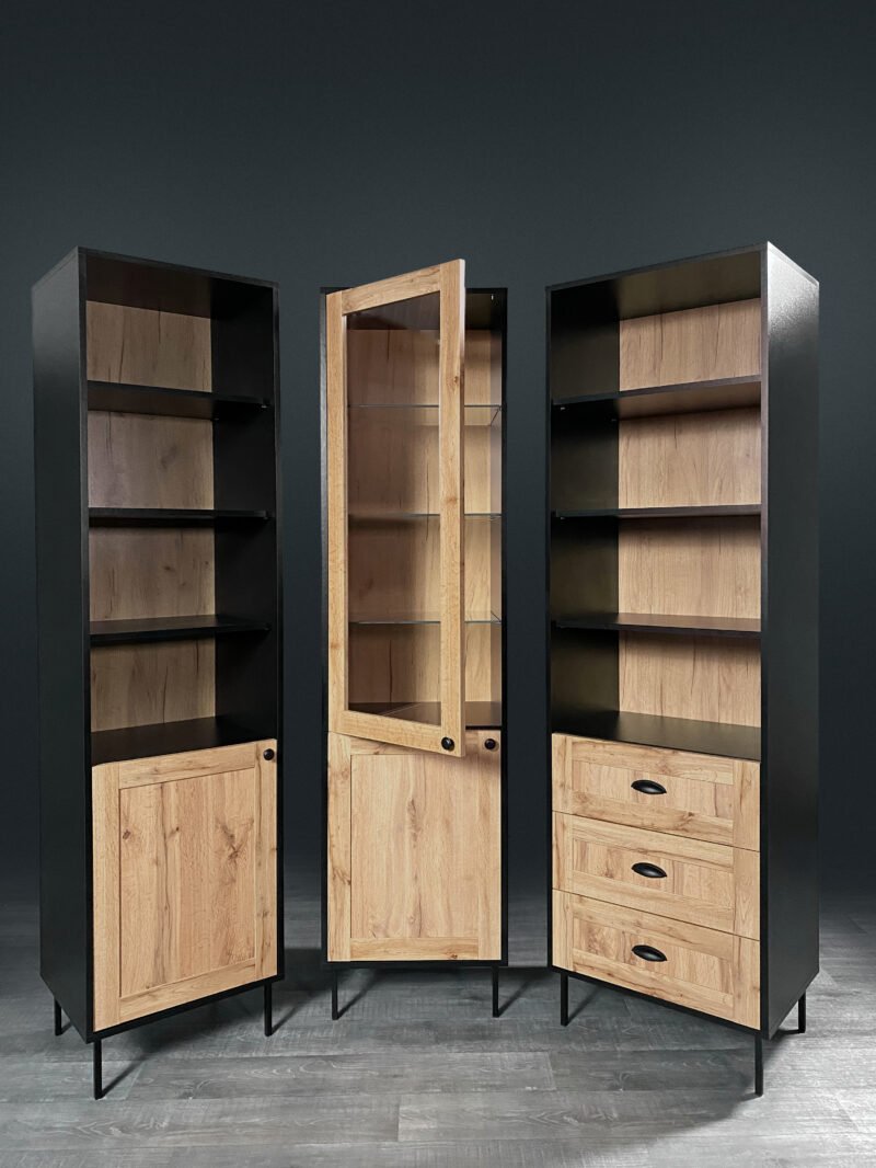 - Stylish Symmetry: The bookcase’s design incorporates a balanced arrangement of open shelves and drawers, creating a symmetrical and visually pleasing composition. This sense of symmetry adds to the bookcase’s aesthetic appeal.