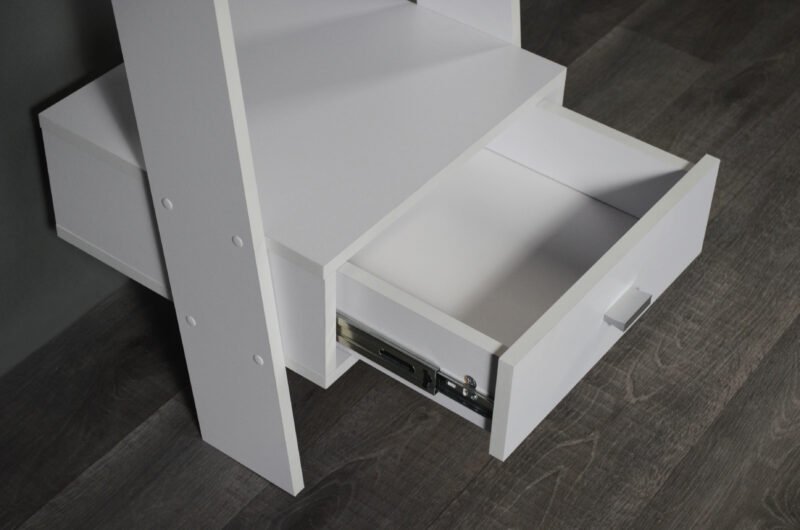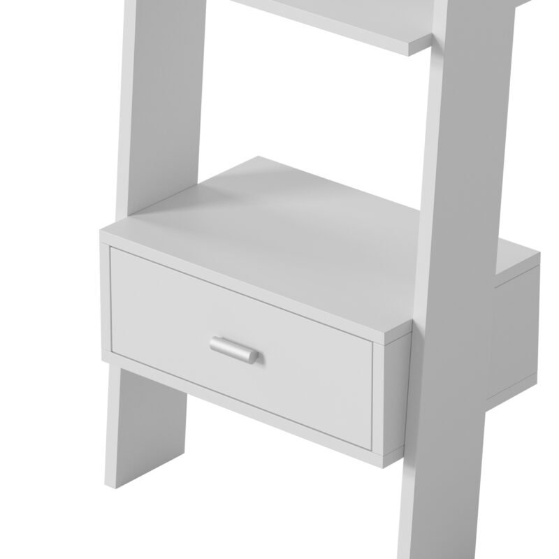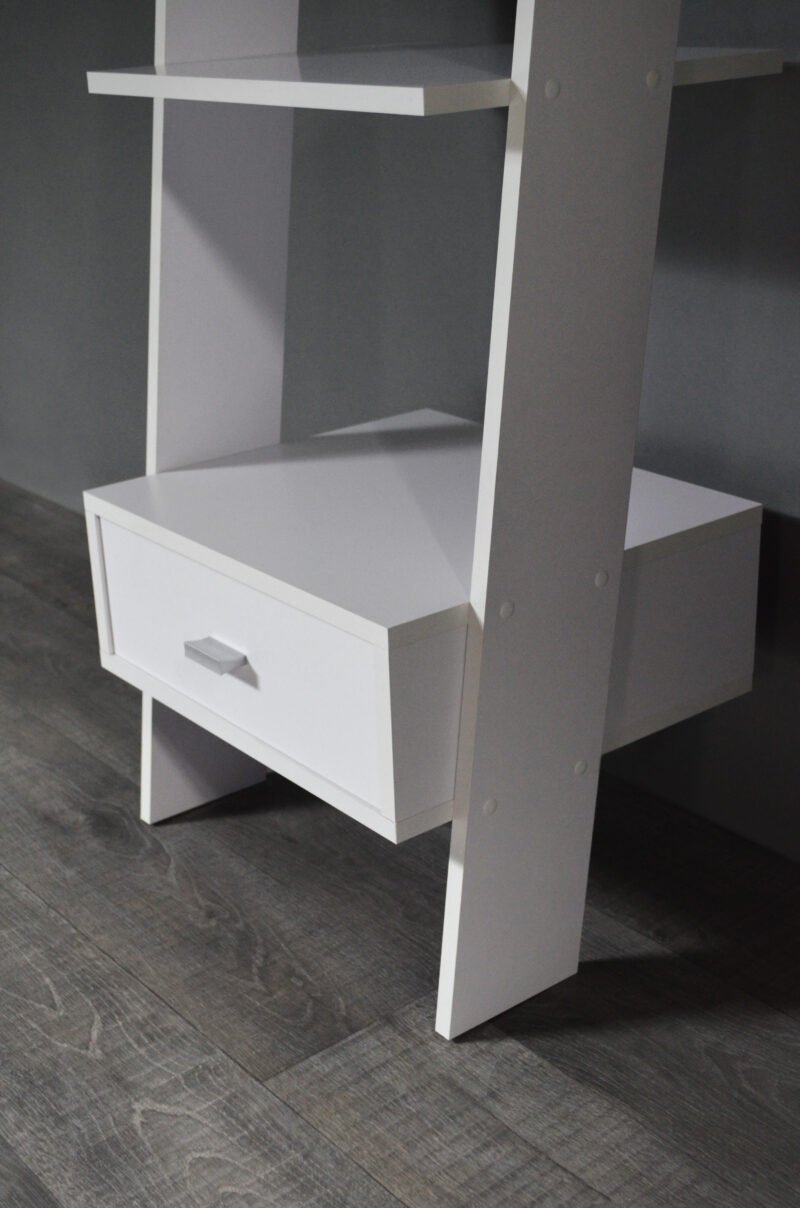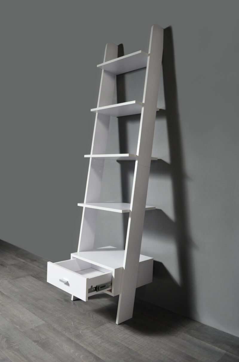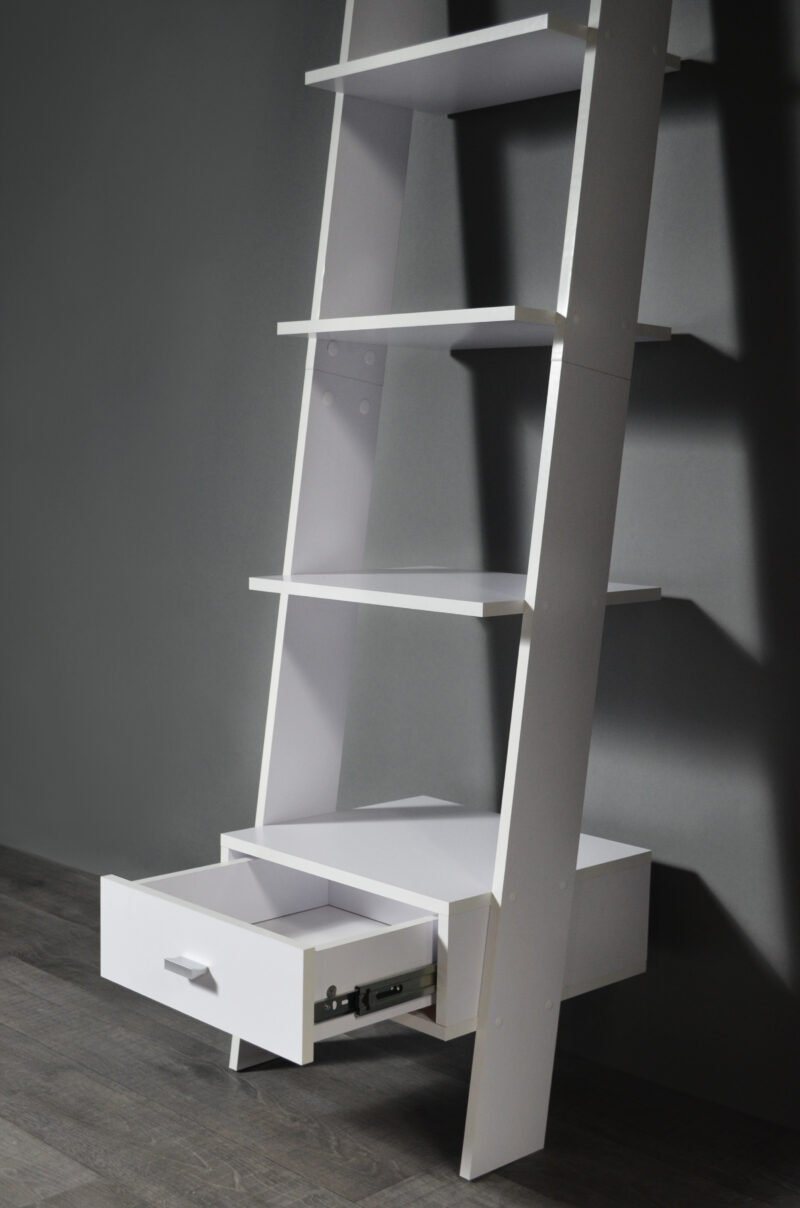 Elevate your living space with a bookshelf that combines form and function in an extraordinary way – the Ladder-Style White Bookshelf with Open Shelves and Drawer. Designed to redefine shelving concepts, this bookshelf becomes an integral part of your room’s dynamics. The ladder-inspired design immediately captures attention, creating a statement piece that exudes modern elegance. The four open shelves invite you to personalize your display, curating an arrangement that reflects your personality and interests. But this bookshelf offers more than just open storage; it incorporates a functional drawer that discreetly holds your belongings. The drawer adds an extra layer of organization, allowing you to keep smaller items out of sight. The ladder steps of the bookshelf contribute not only to its aesthetics but also to its functionality. These steps provide additional surfaces for placing decor, temporarily resting items, or even serving as unique display platforms. Crafted with meticulous attention to detail, the bookshelf stands as a testament to quality craftsmanship. Its durability ensures that it remains a functional and aesthetic addition to your living space for years to come. Experience the fusion of innovation and style with the Ladder-Style White Bookshelf with Open Shelves and Drawer. Redefine your organization and create a captivating visual element that transforms your living space into an organized and elegant haven.