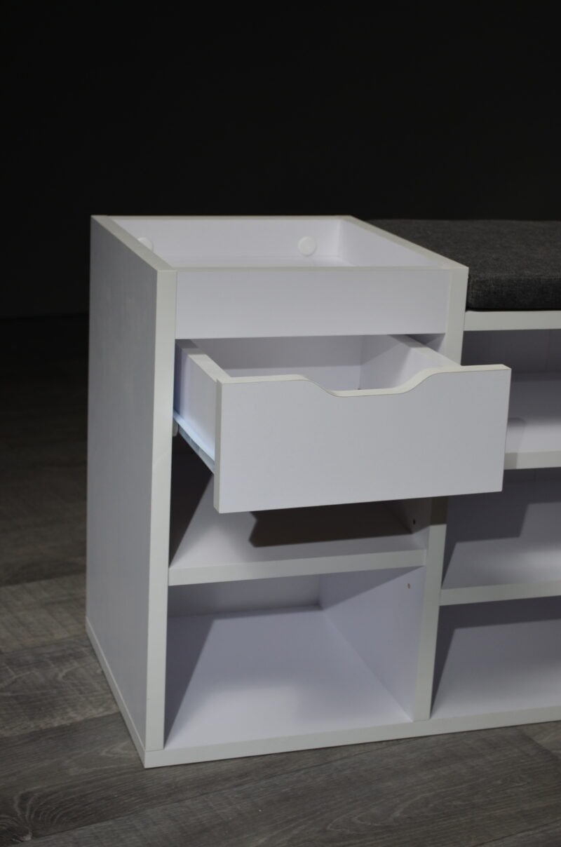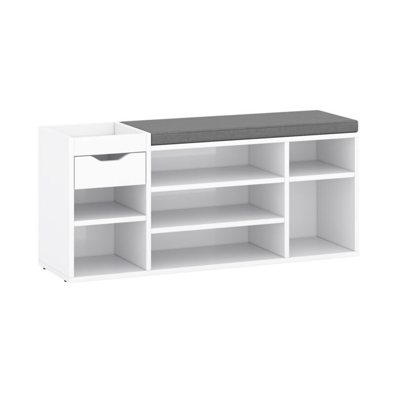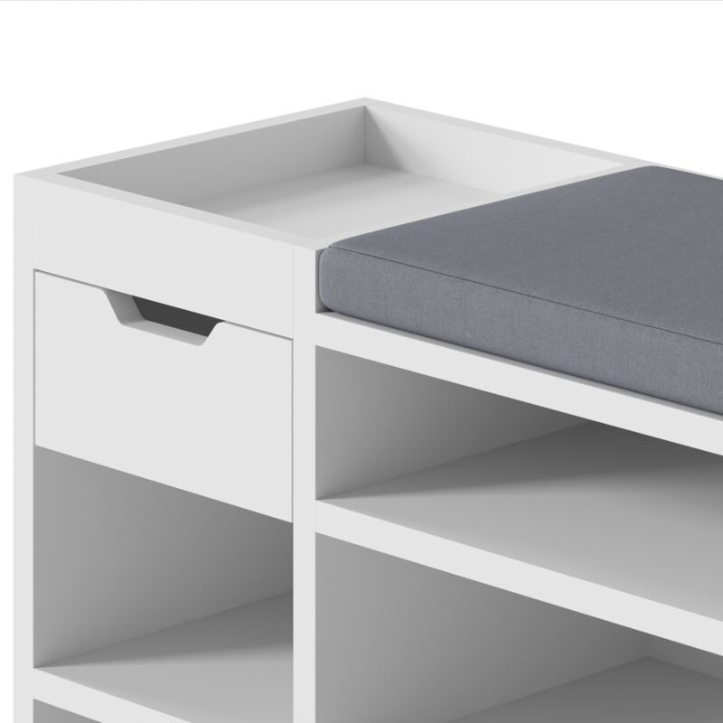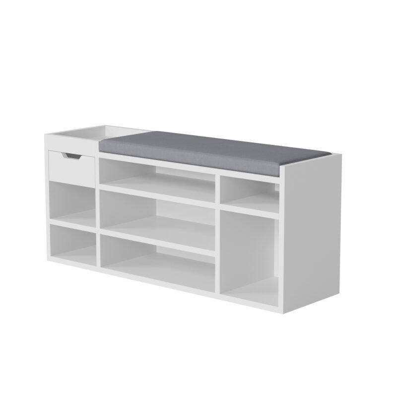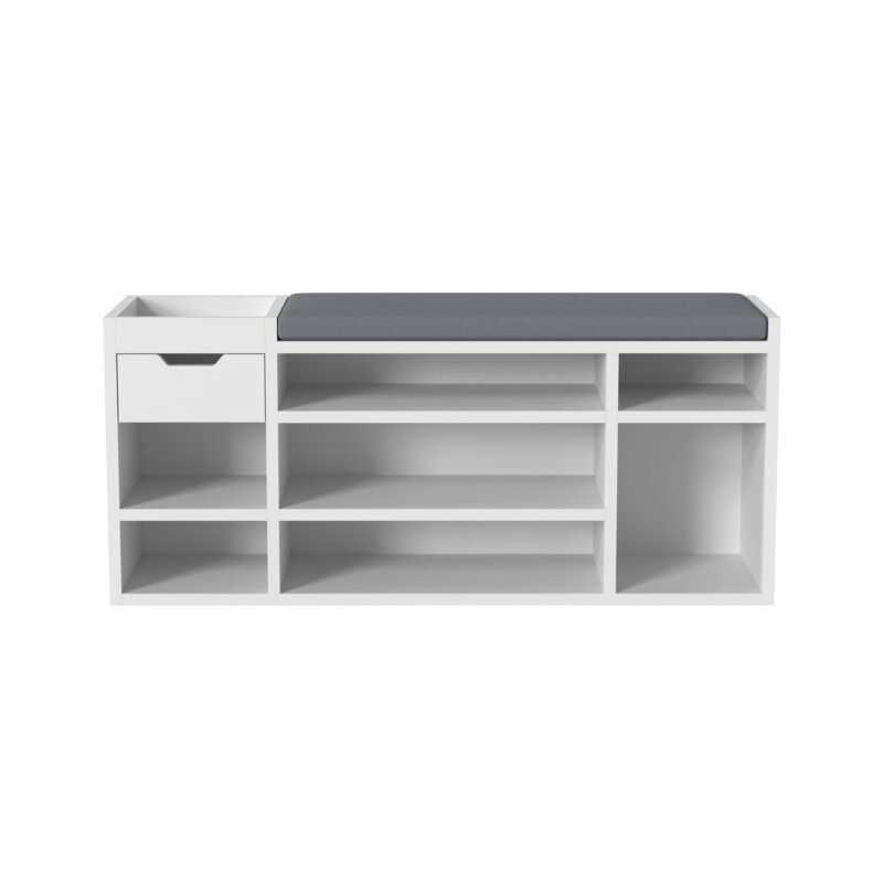 Experience the perfect fusion of style, organization, and comfort with our Multi-Compartment Shoe Cabinet with Drawer and Padded Seat. Designed to redefine your entryway experience, this cabinet transcends mere storage and becomes an integral part of your daily routine. The seven open compartments cater to various shoe styles, offering a dedicated space for each pair. From sandals to sneakers, each shoe finds its place, ensuring a clutter-free entryway. The integrated drawer provides a convenient spot for essentials, adding an extra layer of functionality. But this shoe cabinet is more than just storage; it’s also a cozy seating solution. The padded top transforms shoe transitions into a comfortable experience. No more struggling to balance or searching for a seat; now you have a designated spot for shoe-related activities. With its sleek design and neutral tones, the shoe cabinet effortlessly complements your interior style. Whether you place it in the entryway, hallway, or mudroom, it enhances both the visual appeal and practicality of the space. Elevate your daily routines and create an organized and inviting entryway with the Multi-Compartment Shoe Cabinet with Drawer and Padded Seat. Experience the convenience of dedicated shoe storage, the ease of a padded seat, and the satisfaction of a clutter-free environment all in one thoughtfully designed piece.