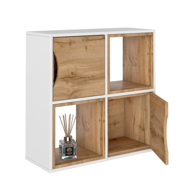 - Adjustable Storage: With four compartments at your disposal, this shelf offers customizable storage options. Two of the compartments feature closed doors, providing concealed storage for items you want to keep out of sight. The other two compartments are open, allowing you to display decorative items or frequently accessed belongings.